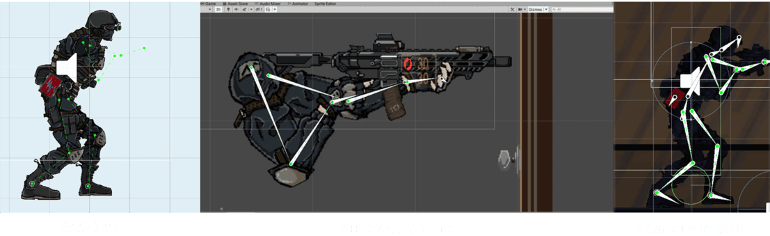 The player character is split into two parts: the body and the gun-wielding arm, each with different scripts.