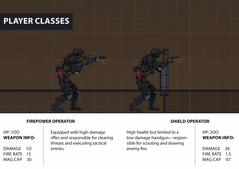 To strengthen teamwork and encourage role specialization, we designed an asymmetric class system. One player takes on the role of a shield operator—with high health but limited to a low-damage handgun—responsible for scouting and drawing enemy fire. The other plays as the firepower operator, equipped with high-damage rifles and responsible for clearing threats and executing tactical entries. Progression and rescue require both players to work closely together, highlighting the core cooperative experience.