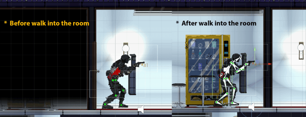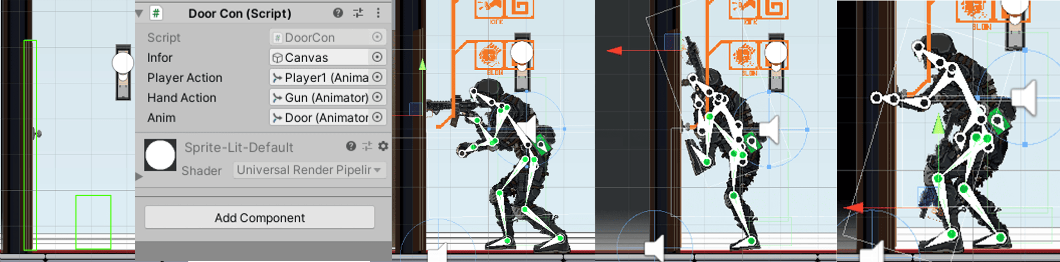 A BoxCollider is in use to check if a player is in front of a door and shows interaction options (open, kick, breach). When a choice is made, all connected Animator components will play the relevant animations. If breached, the door sprite switches to a damaged version.