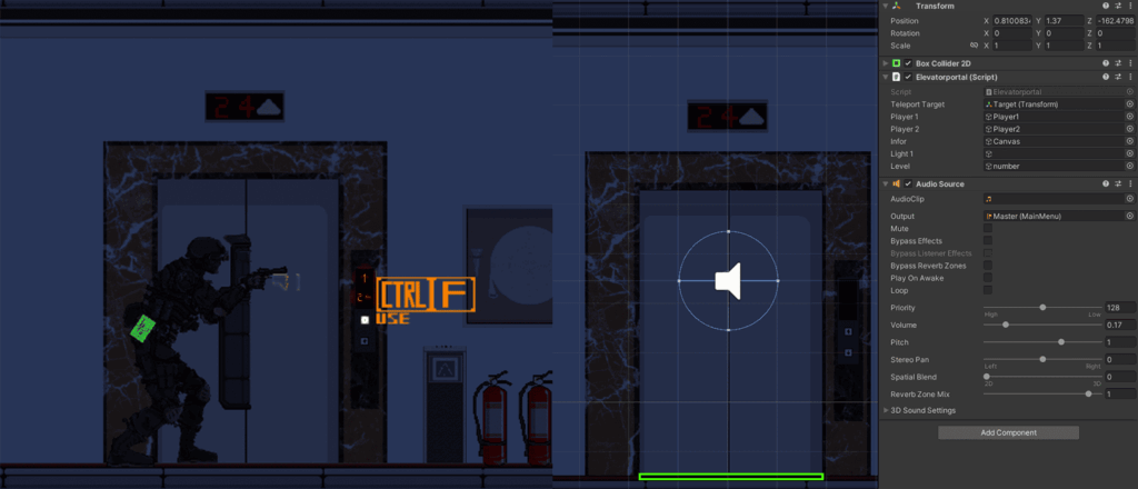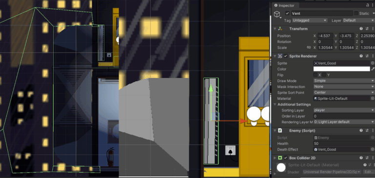 The ventilation duct serves as the entrance to a hidden area within the level. By adding a box collider to the duct cover and applying an enemy script to it, it becomes destructible—allowing the player to shoot on it. Once the cover takes 50 damage, it will automatically break, revealing a path leading downward. (More information in the Level Design section.) This downward path features a complex collider setup that causes the player to fall naturally upon entry, arriving at the fourth floor(Hidden Area).