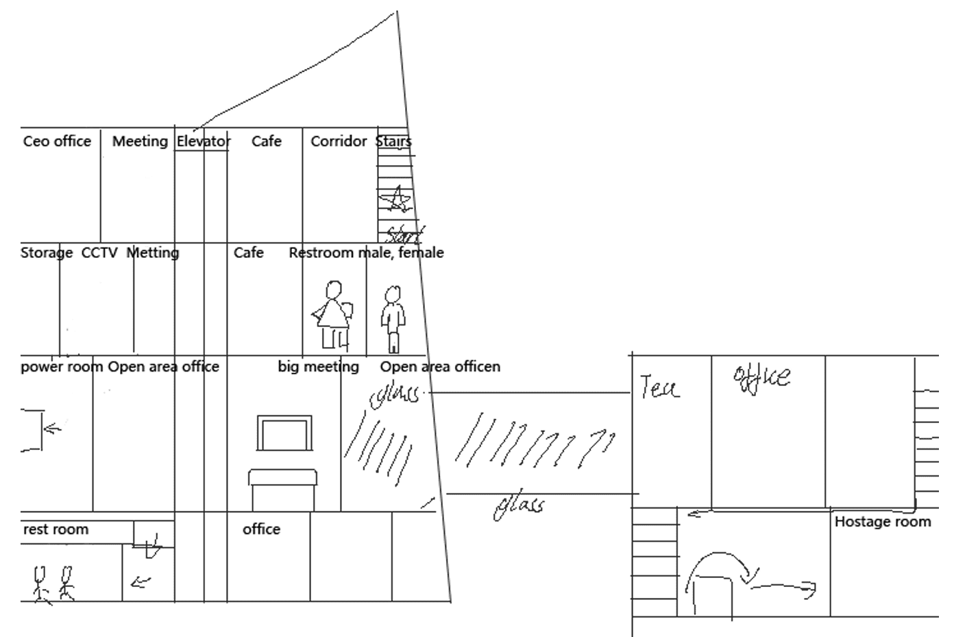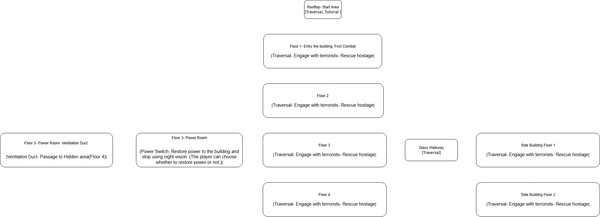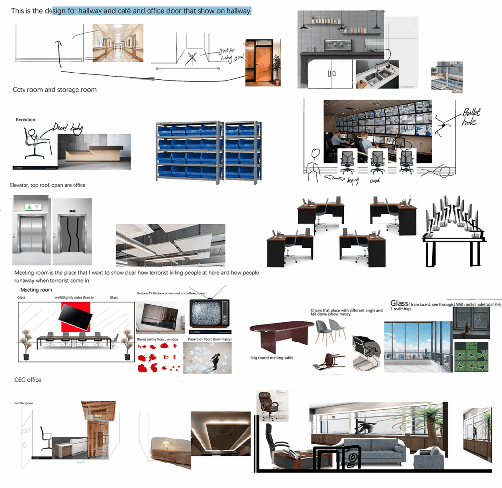 Each floor also contains rooms with unique visual styles or functions, acting as landmarks or points of interest (POI) to strengthen spatial memory. For example, the second floor includes a CCTV room filled with corpse, while the third floor has a meeting room with large glass windows. These visually distinct and narratively rich areas help players recognize where they are during free exploration and reinforce their sense of place.