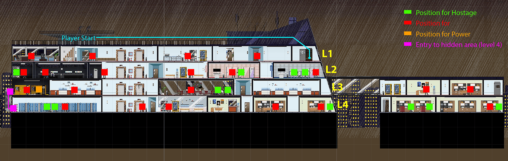 The fourth floor is set up as a hidden area, inaccessible through elevator. Players need to find a ventilation shaft on the far left of the third floor to reach it. This secret zone contains extra hostages, rewarding deeper exploration and offering a greater sense of achievement for completionists. (More information See Game mechanics – Vent System(Entrance of the hidden area))