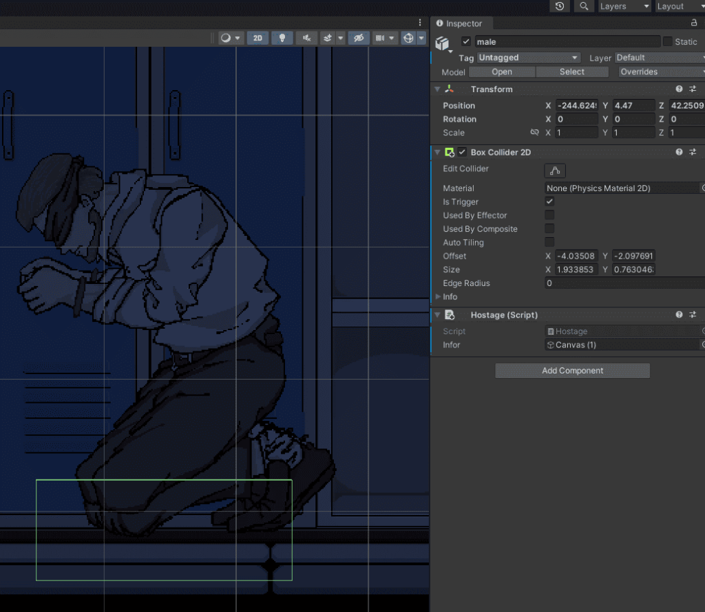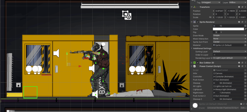 - Body: Includes a Rigidbody2D, BoxCollider, and CircleCollider, used by the CharacterController2D and PlayerMovement scripts. These handle movement, crouching, and the player’s hitbox (jumping was later scrapped but remains in code). The health system is also attached to the body and updates a UI tablet on the player’s waist to reflect current HP.