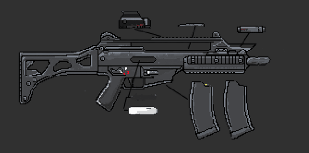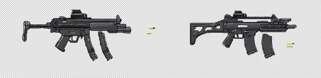 * Each weapon was carefully separated into layers in Photoshop according to its unique structure to ensure the gun is animation-ready. For example, movable parts such as the shell ejector window and magazine were drawn individually and placed on separate layers to allow for proper animation during firing or reloading sequences.